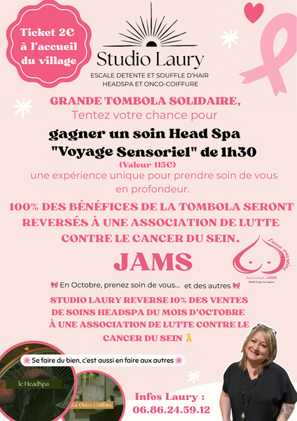 Pour soutenir Octobre Rose, Studio Laury offre un soin Head Spa "Voyage Sensoriel" d’1h30 (valeur 115 €) à remporter en jouant à notre tombola solidaire.