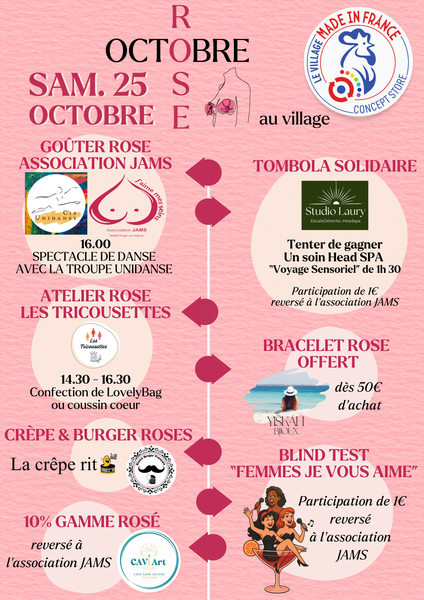 L'association sera présente pour un goûter rose afin d'échanger et partager un moment convivial. La Crêpe-Rit proposera pour l'occasion de délicieuses crêpes roses. En soirée, place à un Blind test spécial Octobre Rose sur le thème « Femmes, je vous aime » : musique, bonne humeur et solidarité au rendez-vous.